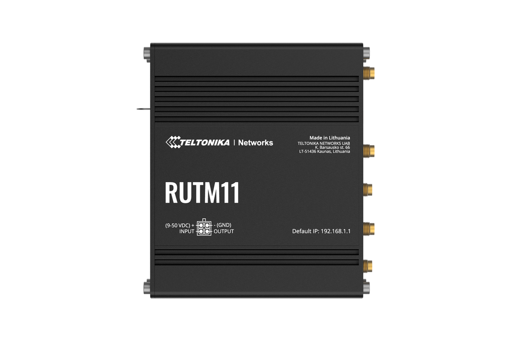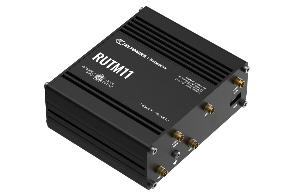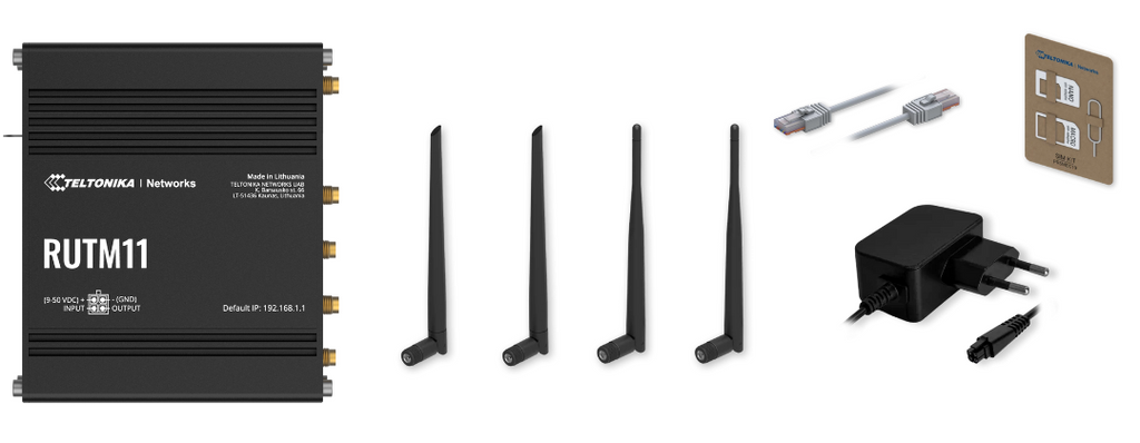 | Pakiranje | RUTM11, 18 W napajalnik, Ethernet kabel (1,5 m), antene (2x LTE, 2x Wi‑Fi, 1x GNSS), SIM adapter |